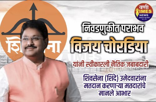 वणी टाईम्स न्यूज : स्थानिक नगरपरिषद निवडणुकीत शिवसेना (एकनाथ शिंदे) पक्षाच्या दारुण पराभवानंतर पक्षाचे नेते विजय चोरडिया यांनी पराभवाची नैतिक जबाबदारी स्वीकारली आहे. सोशल मीडियावरील पोस्ट करीत विजय चोरडिया यांनी वणीतील जनतेचा निर्णय स्वीकारला आणि शिवसेनेच्या उमेदवारांना मतदान करणाऱ्या मतदारांचे आभारही मानले.