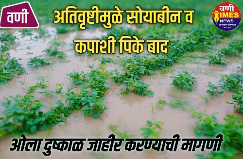पंधरा दिवसापासून सलग पाऊस कोसळत असल्यामुळे सोयाबीन शेतकऱ्यांच्या हातातून जवळपास गेला आहे. सोयाबीनच्या शेतात पाणी साचले असल्याने कोंब फुटल्याने हे पिक आता निरुपयोगी झाले आहे. निसर्गाच्या कोपामुळे शेतकरी रडकुंडीस आला असुन त्याला मोठा आर्थीक फटका बसला आहे. शासन स्तरावरून अद्याप कोणतीही हालचाल व पंचनामे होतांना दिसत नाही. अतिवृष्टीमुळे झालेले नुकसान पाहता शासनाने वणी, मारेगाव, झरीजामणी तालुक्याला ओला दुष्काळ जाहीर करून शेतकऱ्यांना तातडीने नुकसान भरपाई द्यावी. अशी शेतकऱ्याची मागणी आहे.