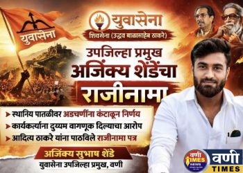वणी टाईम्स न्युज | वणी विधानसभा क्षेत्रातील युवासेनेचे उपजिल्हा प्रमुख अजिंक्य सुभाष शेंडे यांनी आपल्या पदाचा राजीनामा सादर केला आहे. ...